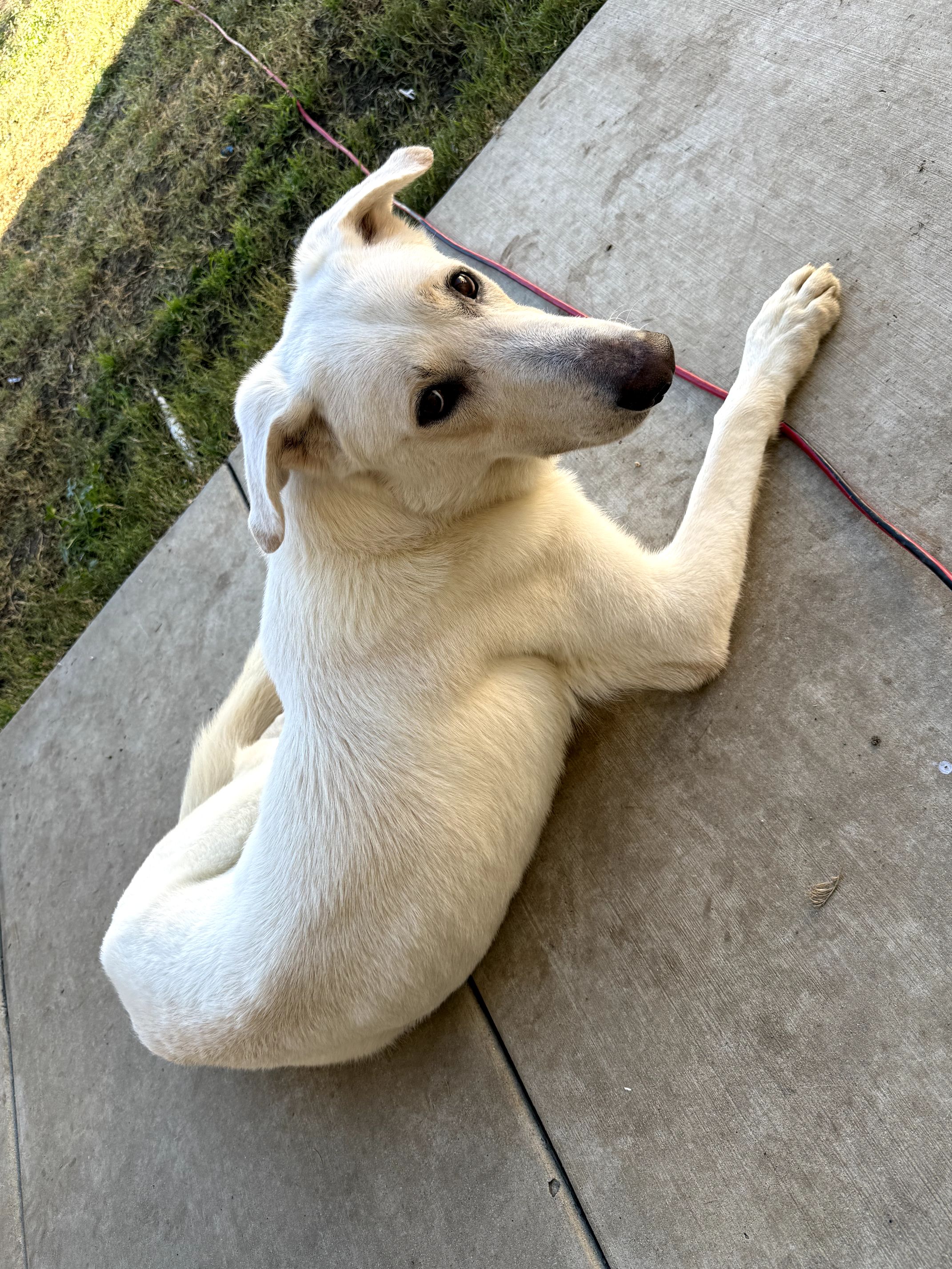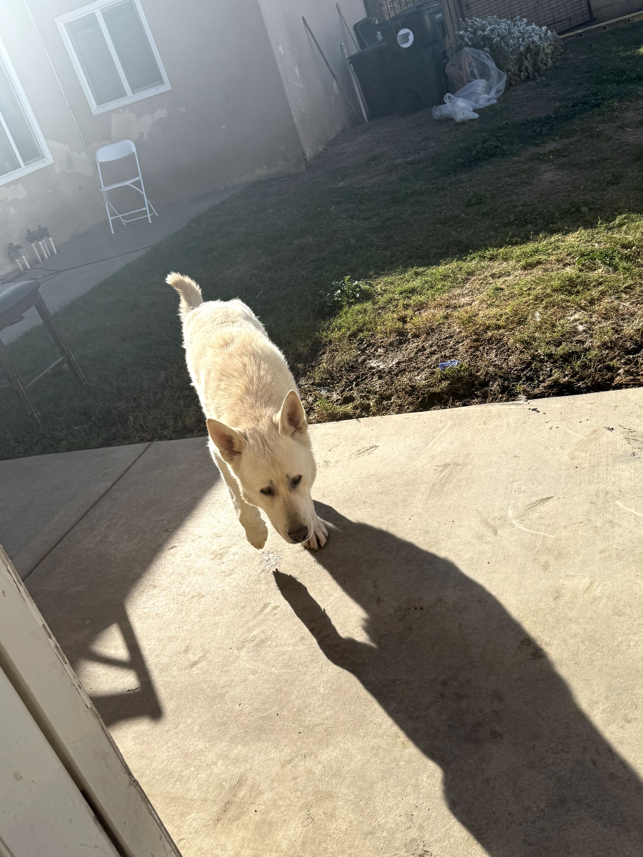 All up is a 3-year-old white shepherd with possible labrador mix. Very sweet boy. Loves the play. Gets along with others. Can play with small dogs and big dogs alike. Is neutered, up to date on this shots including his rabies.