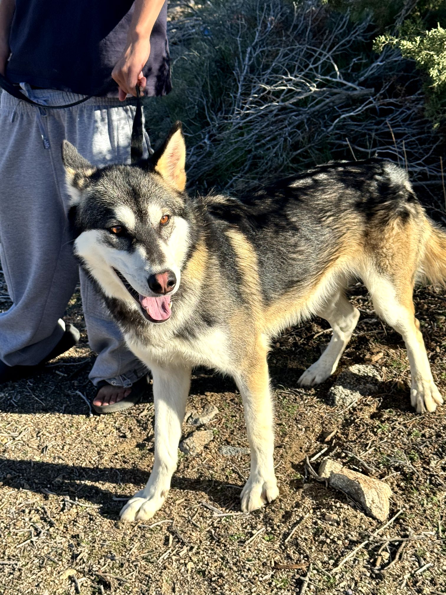 Ingrid is about 2 years old. She is a Sable Shepherd husky mix. She is such a sweet girl. Plays great. Walks good on a least. Has a bit of energy I assume coming from her husky side.
